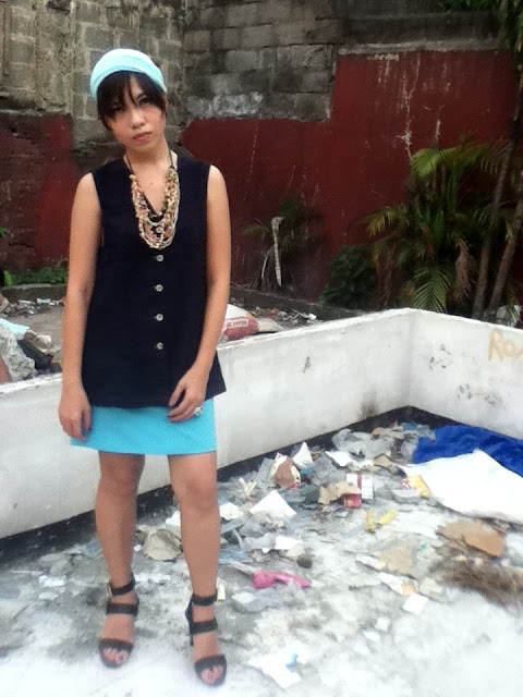 I never thought that scarves are very useful to transform an outfit from boring to stunning. Today, I went to Tondo (Kuya Joseph's house) to celebrate the feast of St. Joseph. I was wearing this simple denim vest (I used as top), my ever favorite sky blue pencil skirt and a pair of slippers. And when its time for my "blog photo shoot" I went to my car, put on this candy-colored accessories, black heels and wrap this light blue scarf on my head. And voila! an instant bohemian outfit.